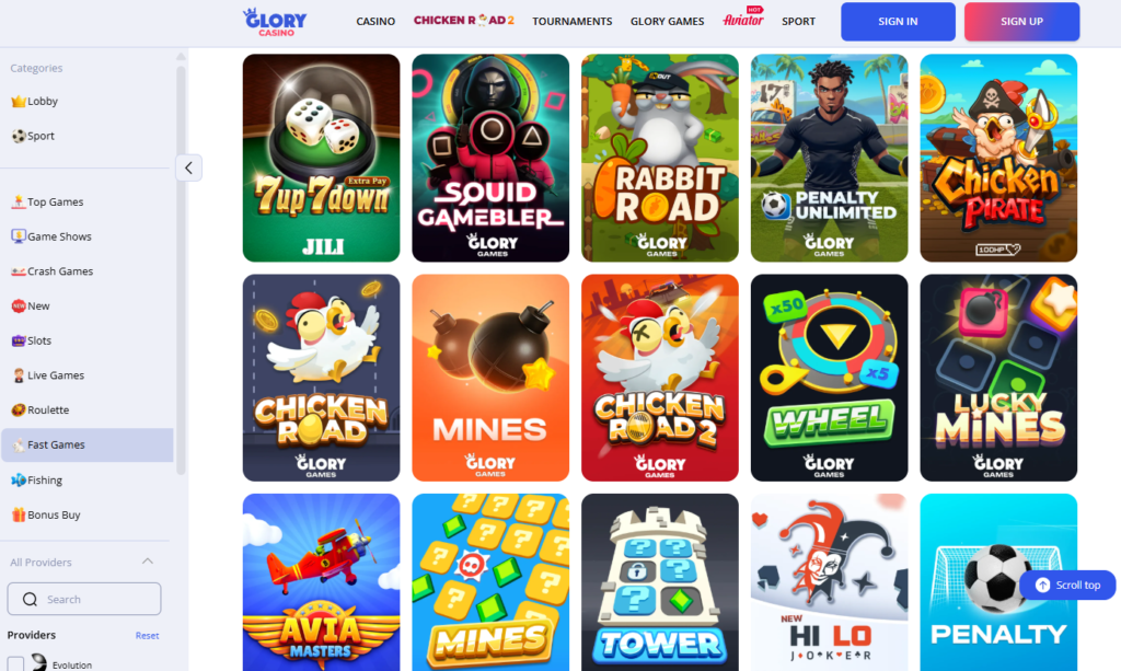 Glory platform has 1,000+ games conveniently divided into sections so that every player can find what exactly they are looking for: